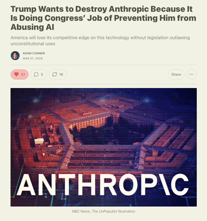 Over at The Unpopulist: "Trump Wants to Destroy Anthropic Because It Is Doing Congress’ Job of Preventing Him from Abusing AI"